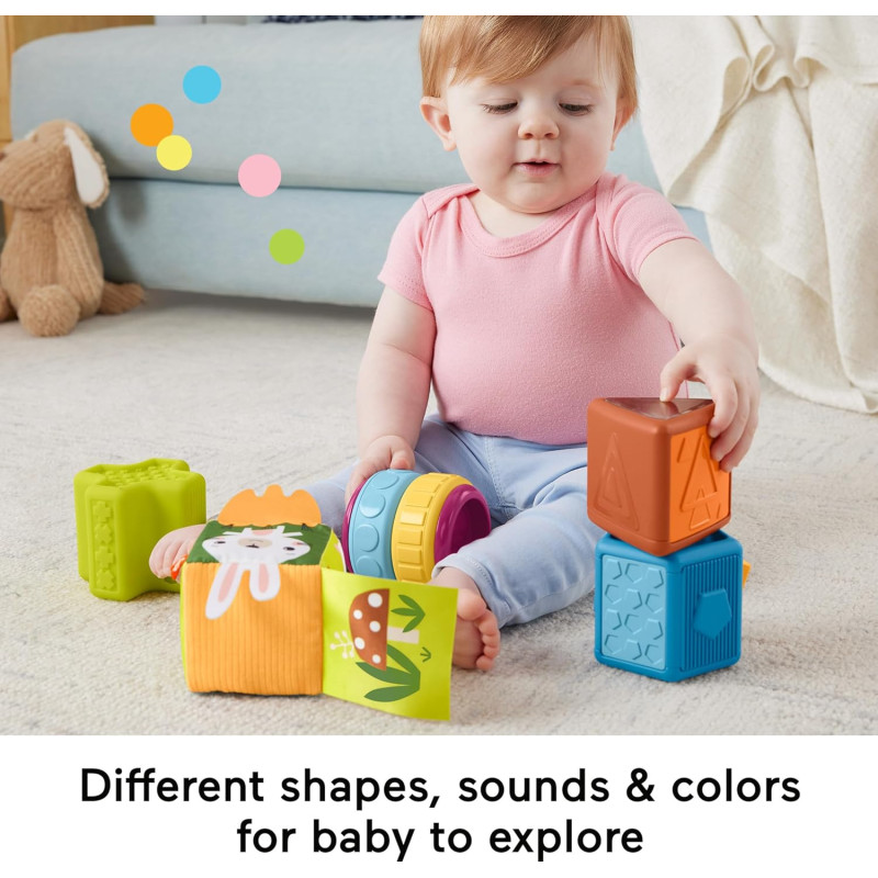 У комплект входять 5 блоків, кожен з яких має унікальну текстуру і функцію, які ваша дитина може торкатися, крутити, клацати і гриміти, щоб зробити гру ще цікавішою.